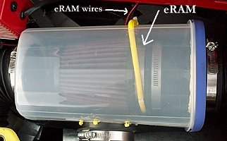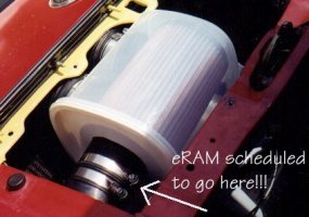 I have only installed the eRAM into my intake setup. I have yet to truly test it out. I clicked it on a couple times just to make sure it works, but it was with the engine off. Even with the engine off, I felt my air inlets (in my CAI setup) and some air was being pulled into the air box and passed through the engine. I need to setup the microswitch, which is part of the eRAM setup. The microswitch is only to be activated at Wide Open Throttle (WOT), as the eRAM is only to be used then (and you really only want it to be used then anyway...otherwise it would create air pressure when you didn't want it and your car would accelerate when you didn't want it to). The microswitch is crappy design in my opinion. You have to mount it so the little button on it can be depressed right at WOT, which means you have to set it up near the TB, Gas pedal, or other part of the throttle cable. Something moving has to hit the switch to activate it. I am having a bit of a tough time seeing where I should install the switch effectively. Also, last time I went up (car is 35 mi. away in storage) to try a setup, I left the switch at home. Shame on me. Anyways, here are some pics of my setup as it is right now, and some miscellaneous pics of the eRAM. Go to eRAM's page to see their boasting comments. But remember, one good think about the eRAM guys is that they only claim 4-6%, which is feasible, unlike so many other companies claiming gains of 20HP or more from a stationary spiral that is supposed to create a vortex effect to up HP (which by the way, the eRAM has such a device installed at the end of it's assembly after the fan). I'm not saying 4-6% HP is awesome, just that it is credible. 4-6% HP gains would equate to 6.4-9.6 HP for stock NAs and 8-12 HP for stock Turbos. This is supposed to be rear wheel HP, which for $300, is somewhat reasonable.