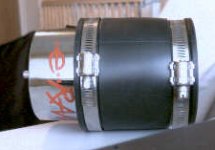 This is the rubber coupler used for eRAM. Like I said, in my setup it is placed over the stock plastic elbow going to the MAF. I had to put the 3" pipe underneath the stock elbow to make sure the clamp didn't just collapse the elbow. The pic on the right is another rear view, showing the black plastic fins (used to create a vortex). The wires are nice and thick and firmly attached with solder joints and plastic screws which thread into their places.