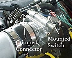 The SWITCH MOUNTED arrow shows where I epoxied the switch into place. I used some sheet metal and made a thin custom bracket that bolts into the original TB bracket. The two wires going into the switch are the best thing to look at to understand how the switch is laying. Look below for a pic of how the switch looks alone. I had to raise the furthest TB coolant line a tad to give clearance for the switch location. The CRIMPED CONNECTOR arrow shows where I used a female FASTON electrical connector. I remove the plastic from the connector and opened the crimping part on the seam to get it over the plastic coated throttle cable. I crimped it on, and I folded over the connector so it would stick down. The "blade" of the switch lays under the coolant line, and sticks out right underneath the throttle cable where, when the blade connector gets to that position, is activated.