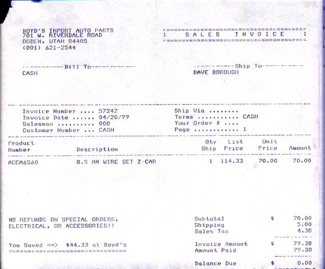 Most people are concerned with how much these wires cost. Magnecor is notorious for expense. If you buy direct expect to pay over $120 for the wires. If you do your research you could be AS LUCKY AS I WAS. If you think that $70 is too much to pay for a nice wire set, then you may consider ACCEL or other brands which offer thick wires for less money. One think scared me about the order...I had six wires and I noticed two were distributor to coil wires, so I was missing a distributor to plug wire!!! But I looked around and saw I dropped one of the plug wires. So Magnecor actually sent me 8 wires, two being distributor to coil wires (I wonder if they always do this!!!).