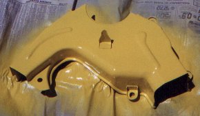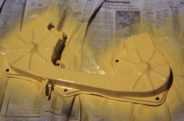 These are as prepped as I was willing to get them...they are actually quite ready...the idler pulley crossmember looked a little hashed but its really not bad. I sanded a little rust off of it before continuing. The next step is to give the parts a couple coats of good primer. I just used Rustoleum grey primer. They looked nice just like that, but not near as nice as they would look. Let the primer dry and then you're ready for the color you choose. Go with the classic red or switch it up with blue...or if you want to go all out...go YELLOW!!!